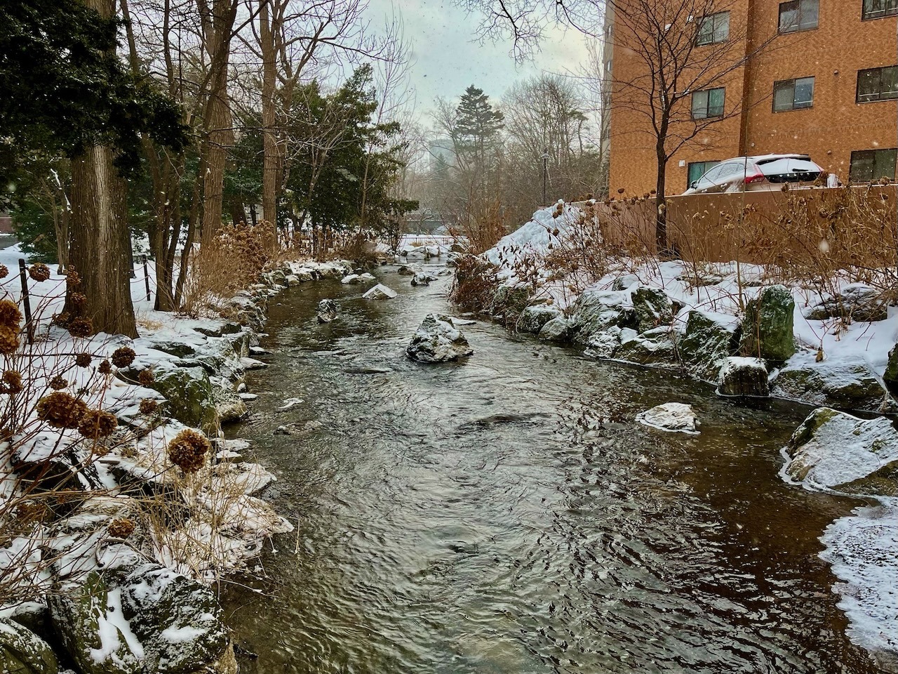 札幌コンサートホール・キタラ裏側を流れる鴨々川 、橋は中洲2号橋。