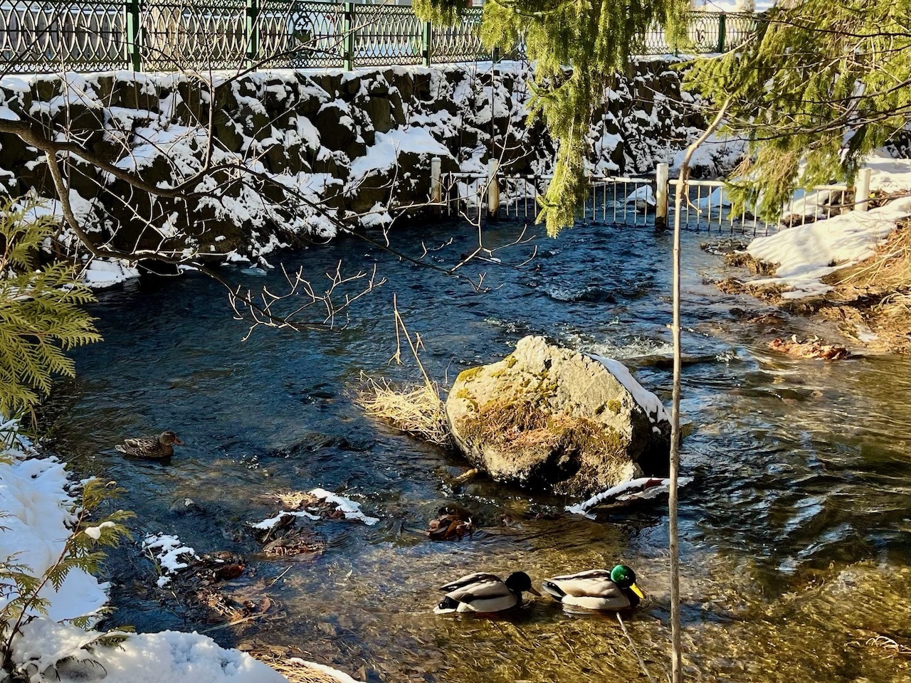 札幌コンサートホール・キタラ裏を流れる鴨々川 。この辺りはマガモは少な目だが、ひと昔前に遡れば沢山居たこともある。エサが一杯あったからだ。マガモにとって食は職、職が減れば過疎となる。長年中島公園を観察し続けた私の結論は、エサやる人とマガモの数は比例する。少ないのも寂しいけれど、川がマガモで埋まる状況を見て異常を感じたこともある。中洲第1号橋から撮影。