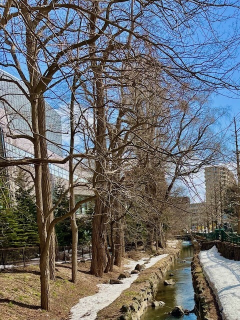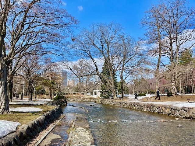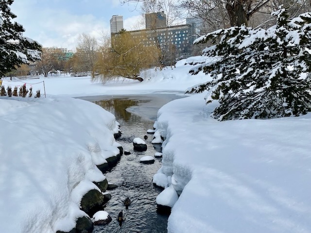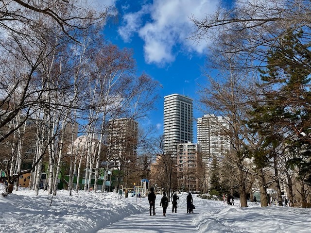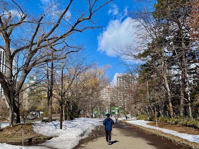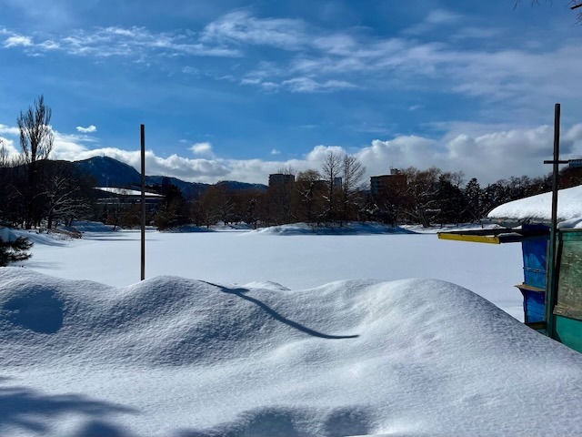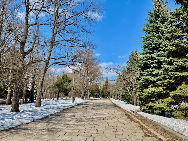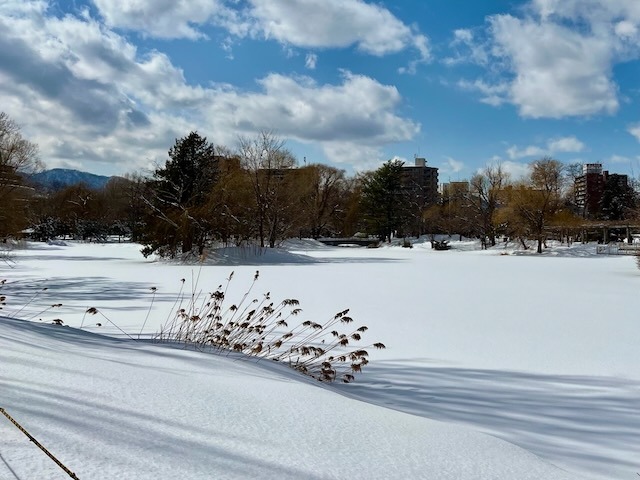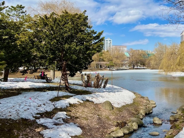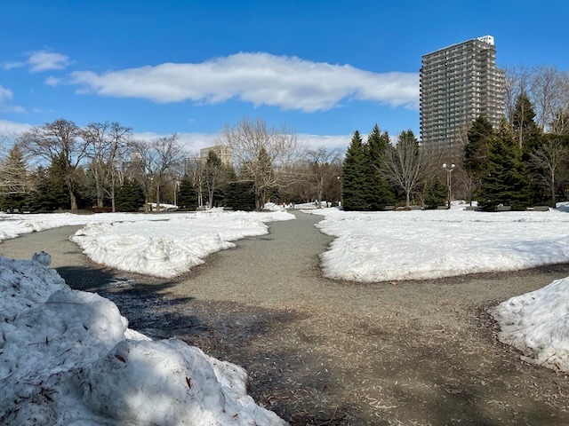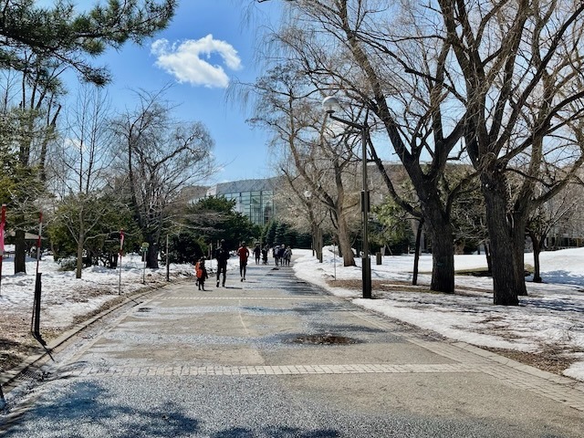 札幌市街地の雪は無くなっても中島公園はこの通り、足元は大丈夫? ついでに言うと20年ぐらい前まではコンサートへ行く園路はロードヒーティングだった。