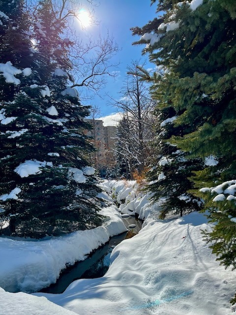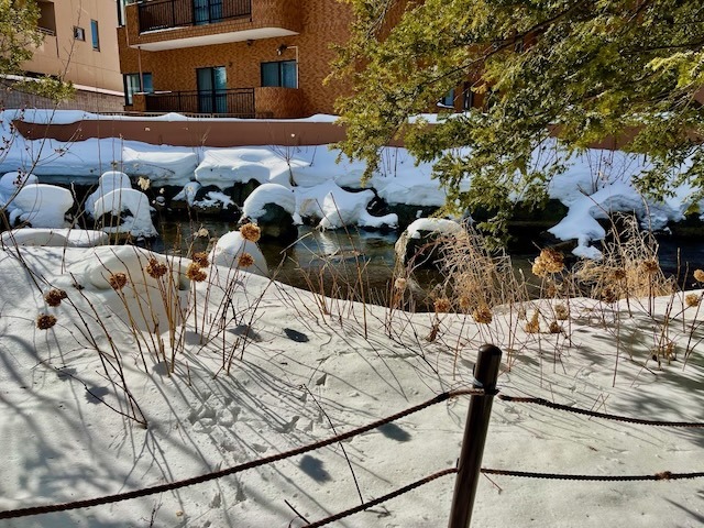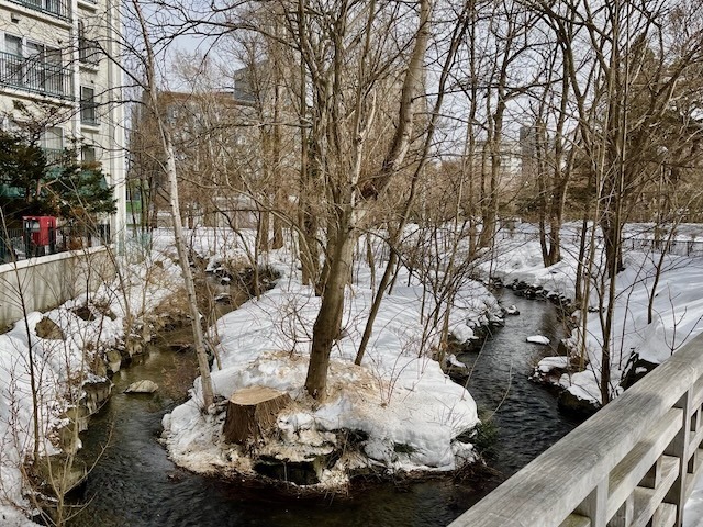 キタラ前広場前を流れる小川、キタラのシンボル「相響 」には保護の覆い。