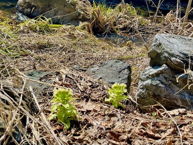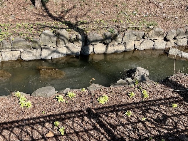 菖蒲池南側、東岸の木々から落ちた枯れ葉がビッシリ。